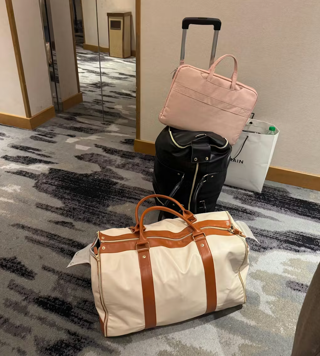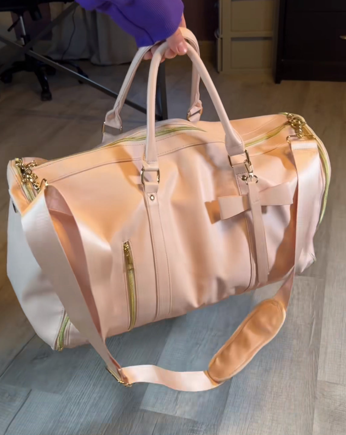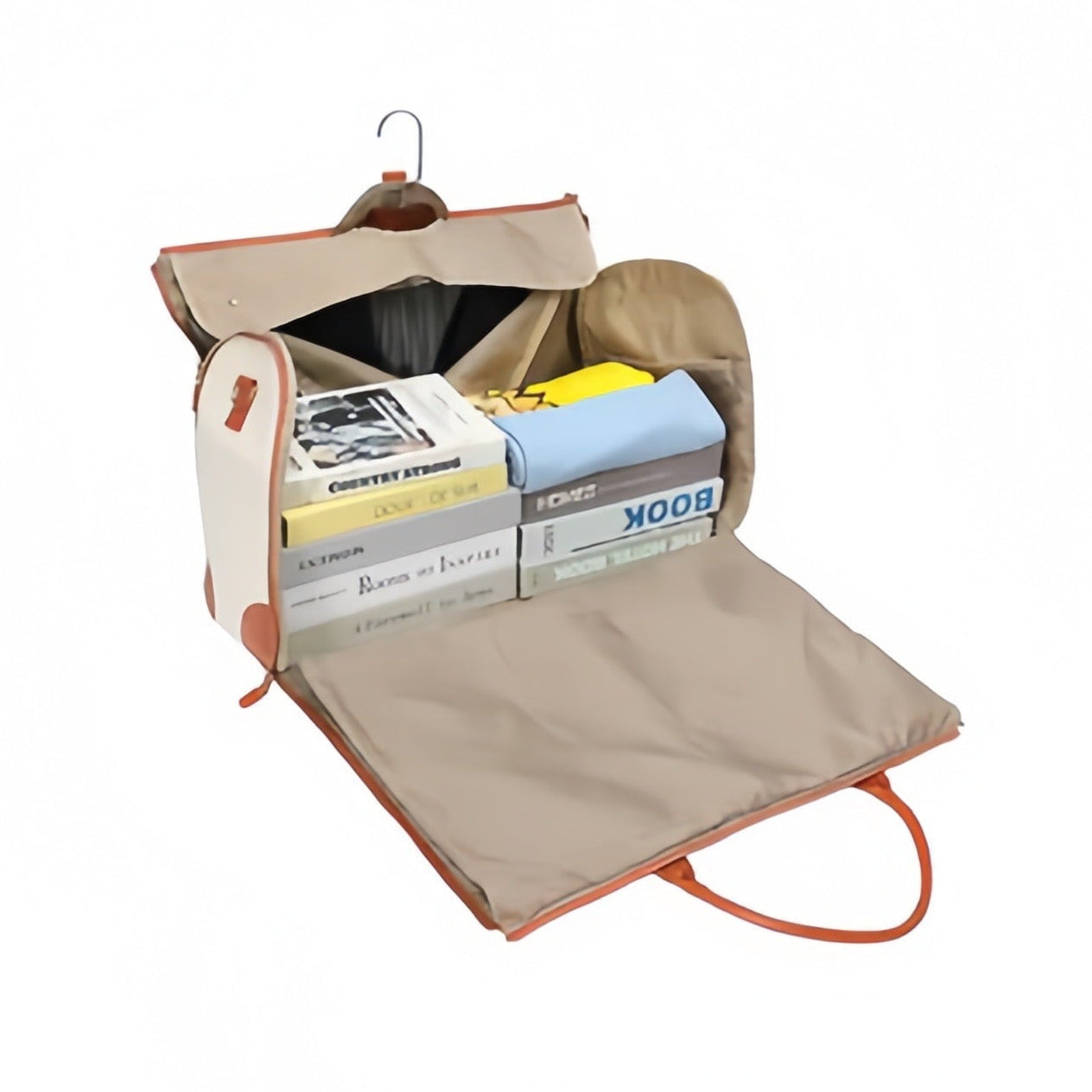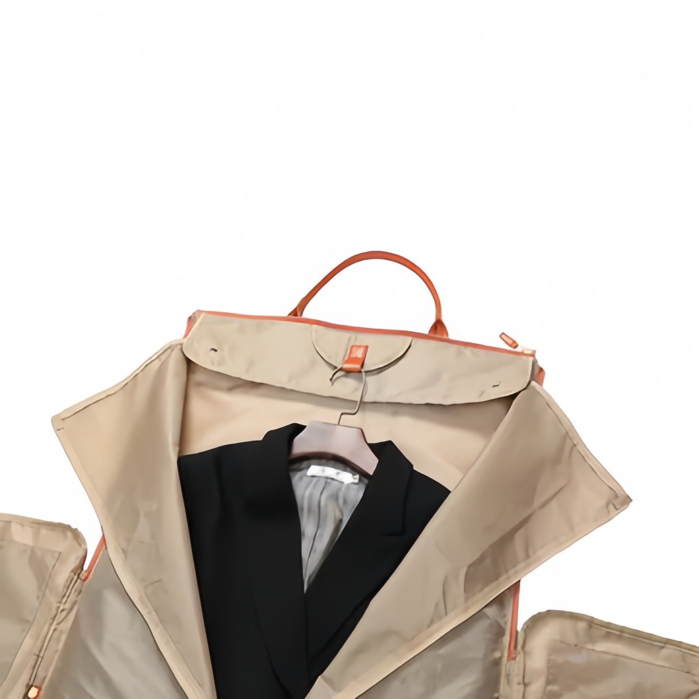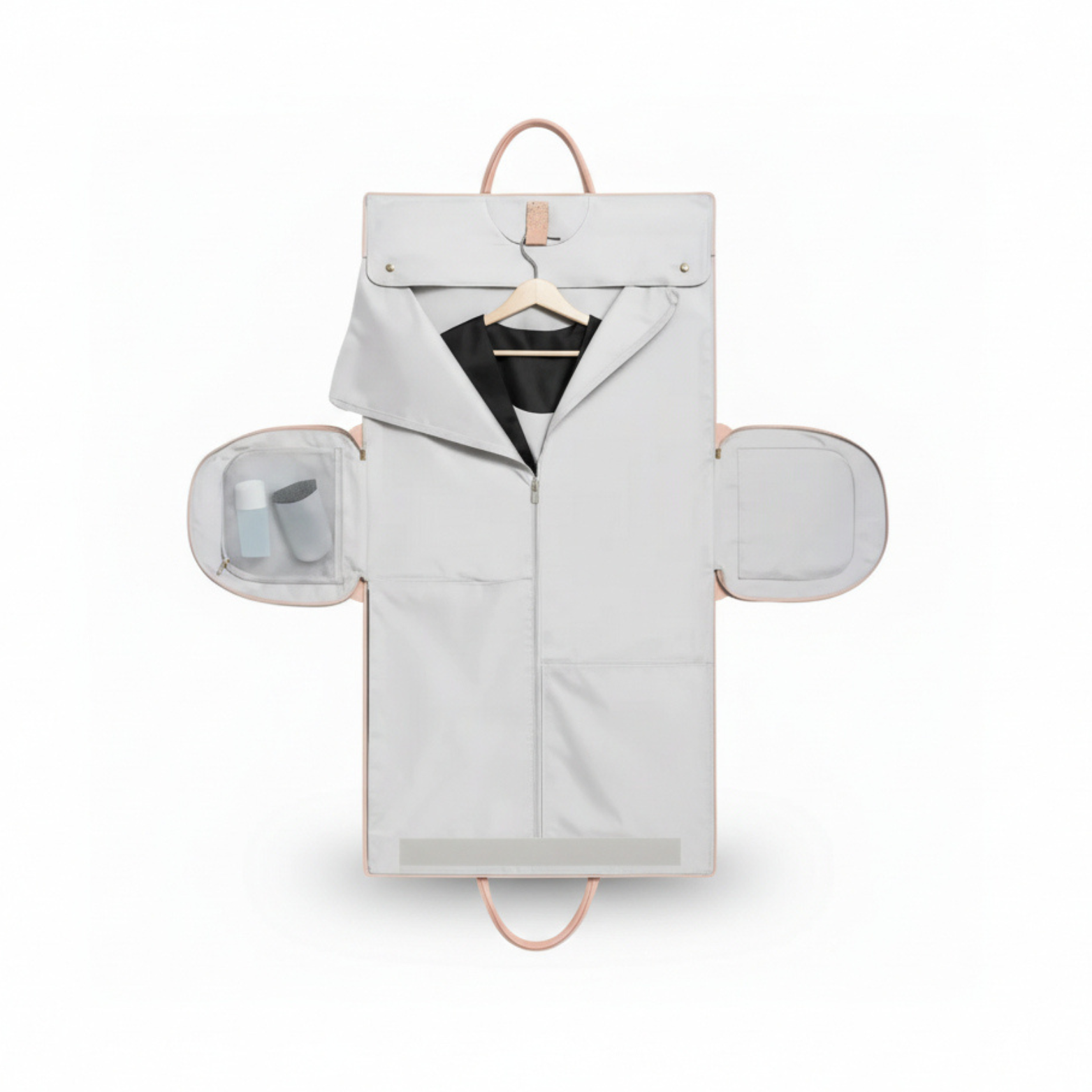 服がシワにならないように設計された絶妙なジッパー位置、そして洋服用フックが、バッグの中での無駄な移動をしっかり防ぎます。